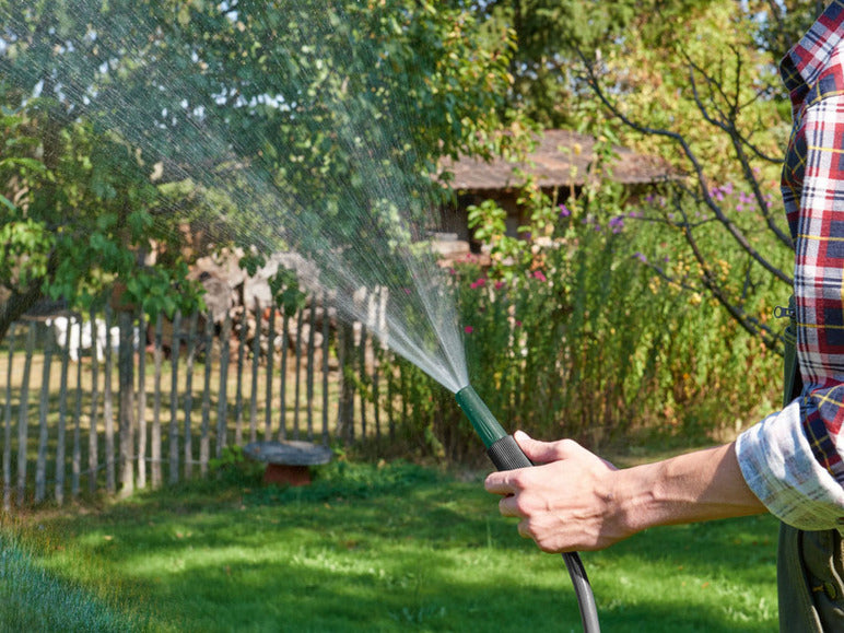 Flexible garden hose, approximately 25 m long, with connecting pieces and watering nozzle Wall mount