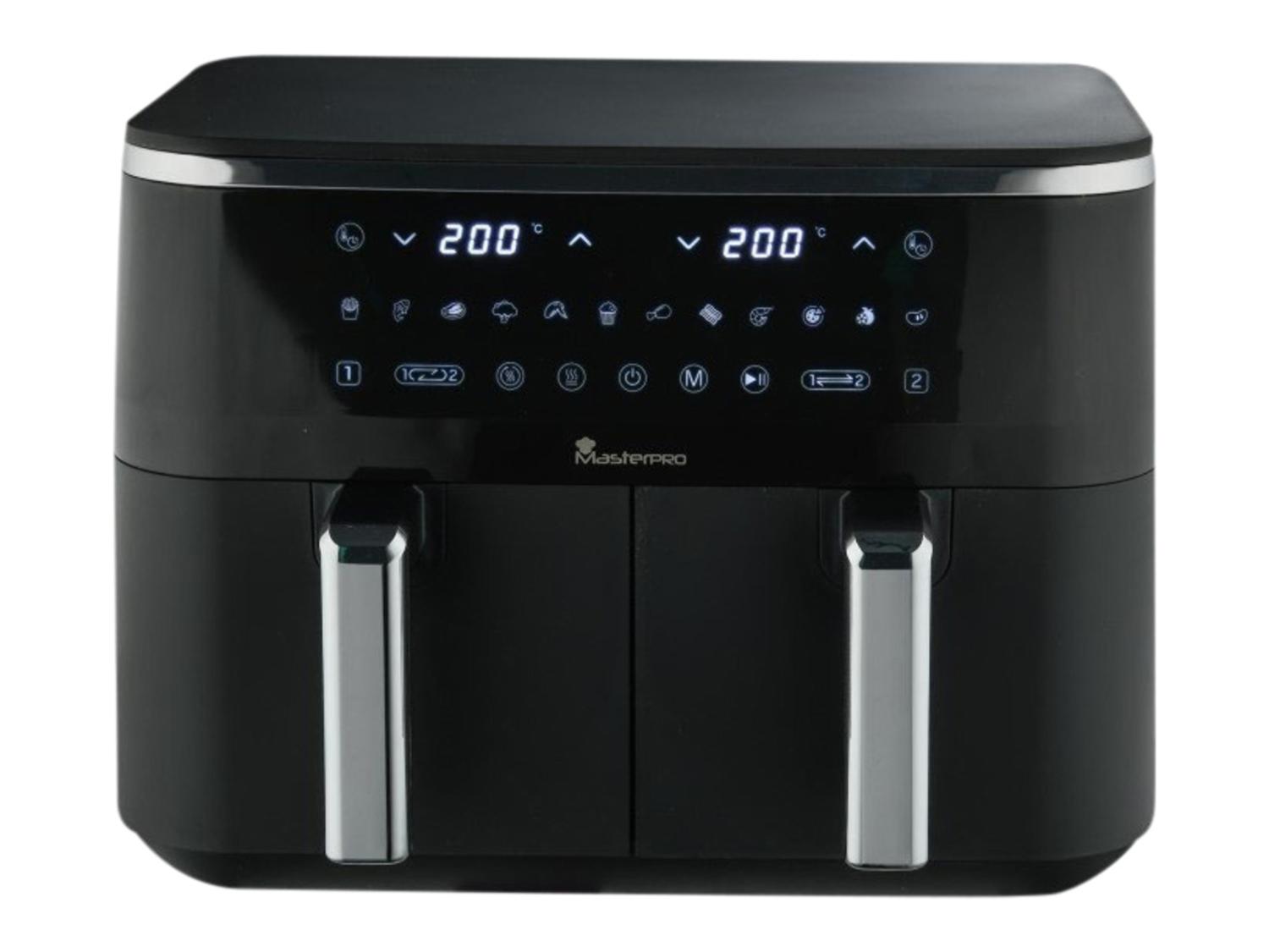La Friggitrice ad aria calda a doppio cestello Masterpro® BGMP-954, 9 L riscalda l’aria e la fa circolare all’interno di ciascun cestello per cuocere gli alimenti in modo uniforme. È pensata per cuocere, arrostire e riscaldare diverse preparazioni, consentendo anche di separare porzioni o ricette nei due comparti.