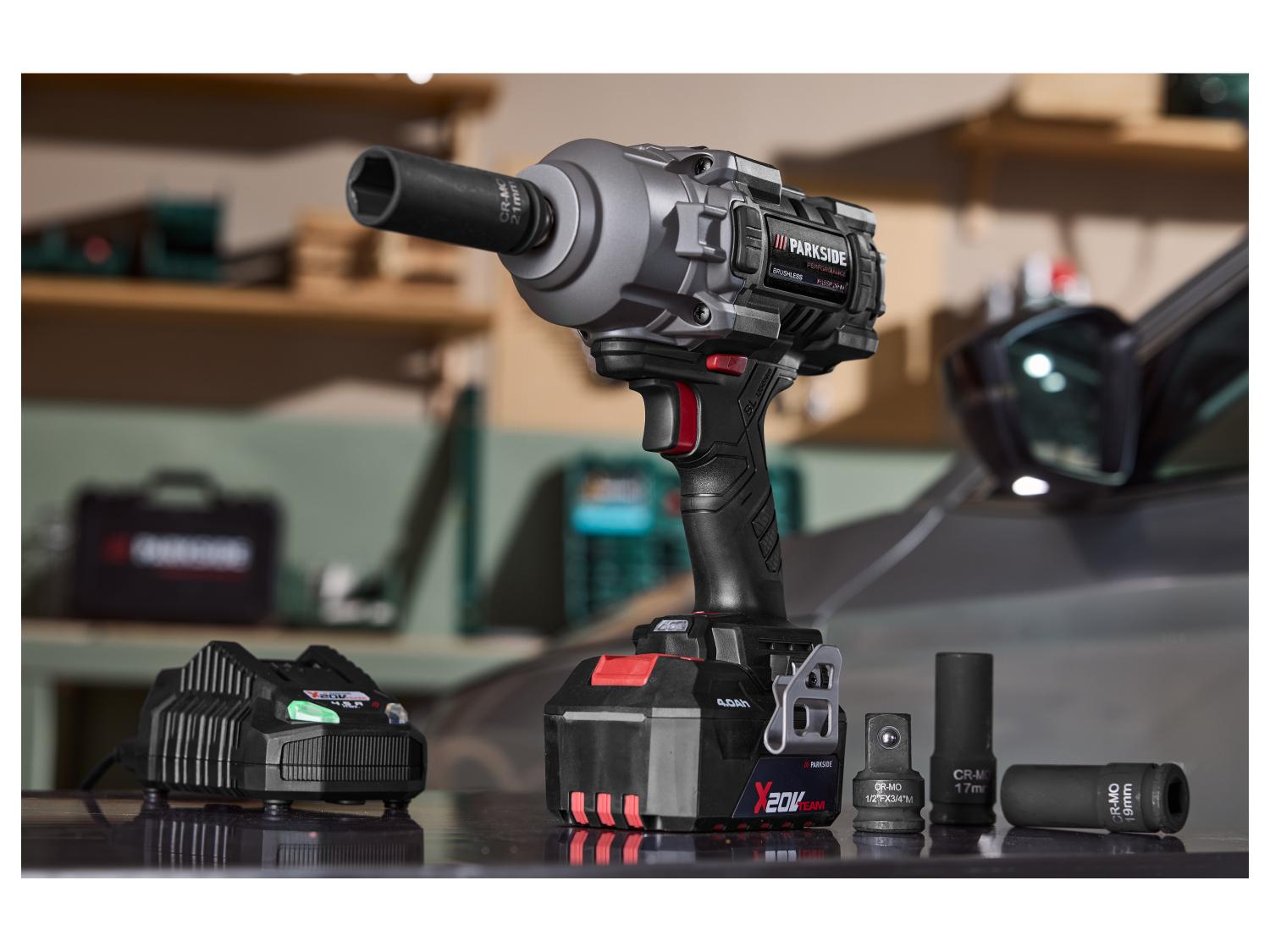 Sono inclusi l’avvitatore a impulsi, tre bussole, un adattatore per bussola, una valigetta, una batteria e un caricabatterie. Il prodotto appartiene alla piattaforma PARKSIDE X 20 V TEAM ed è compatibile con batterie e caricabatterie della stessa gamma previsti dal sistema.